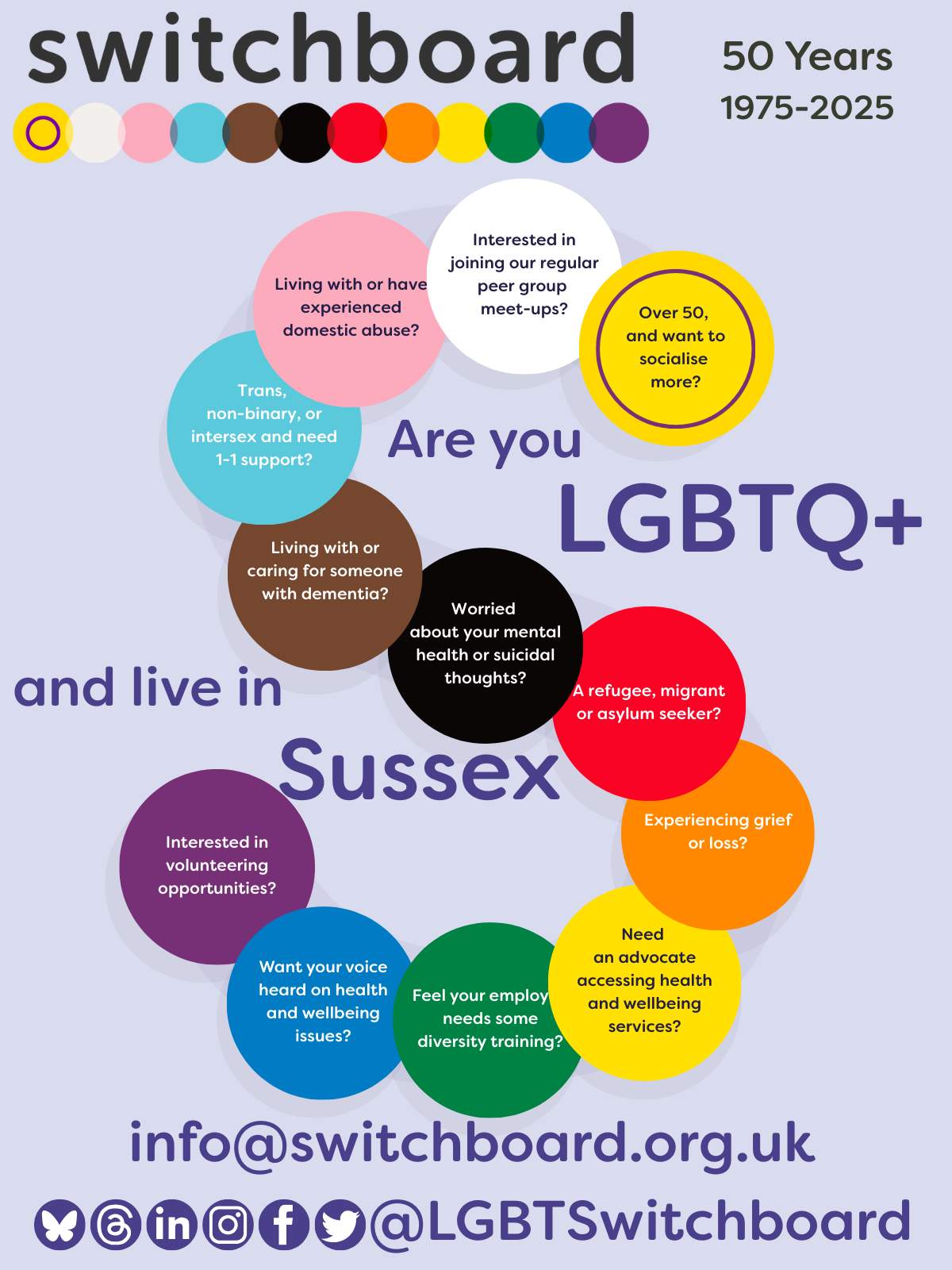 Switchboard is setting up a temporary pop-up office in Churchill Square for one week, bringing information, support, and community engagement into the heart of Brighton’s busiest shopping centre. Staff will be on hand to answer questions, share resources, and connect with LGBTQ+ people and allies in an accessible, welcoming space.